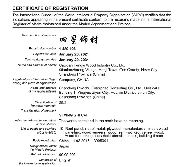 2021年1月20日四星板材注冊馬德里商標正式開展品牌的國際化